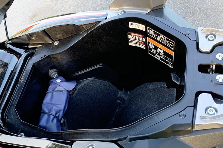 Бесключевой доступ работает как надо, а всякие фишки типа блокировки руля молчаливо демонстрируют другим, как надо их реализовывать. Открыть бак и сиденье легко и понятно, а под сиденьем достаточно места для одного небольшого полнолицевого шлема (большой шлем с внешними воздухозаборниками может не влезть) или большого арбуза. Там же есть прикуриватель, так что арбуз можно заряжать по дороге😂